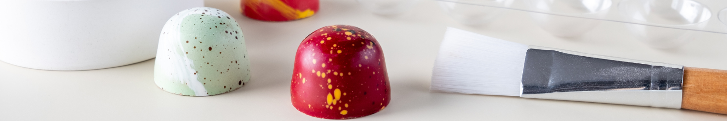Att måla praliner med airbrush ger ett underbart utlopp för din kreativitet i köket! Det är viktigt att värma färgsprutan med en hårfön eller värmepistol innan du börjar, så att färgen inte fastnar/stelnar i en kall spruta. När man målar med airbrush så uppnås bäst resultat i en lokal med en temperatur runt +18-20°C. Om det är för varmt i lokalen kommer färgen att rinna i formen och din finish blir inte som du tänkt dig. Med det sagt så kan bra högkvalitativ färg och rätt teknik öppna för oändliga möjligheter!
