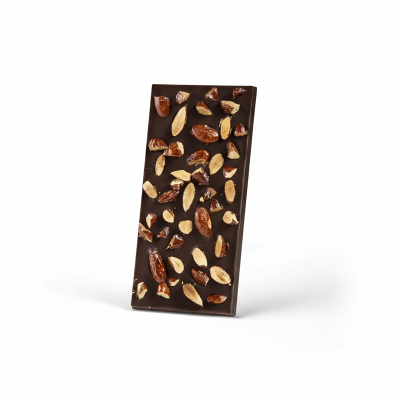 Mörk choklad med 70% kakaohalt från Guays, Ecuador, som innehåller hela, karamelliserade Valenciamandlar.