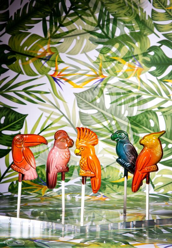 Dessa fina tropiska fåglar kan gjutas i choklad för att bli styckbitar eller chokladklubbor. Bara fantasin sätter gränser för färgprakten! De passar till exempel mycket bra till ett barnkalas eller till temafest. Använd våra papperspinnar för att göra klubborna!