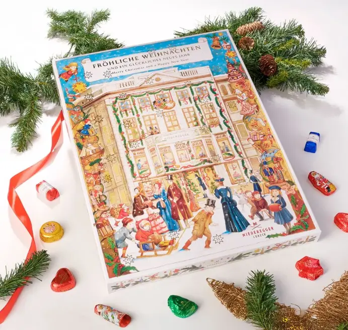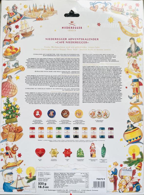 Upptäck julens ljuva magi med Niedereggers adventskalender med en vacker nostalgisk "Caféhaus"-design. Förlagan är Niedereggerhuset i centrum av Lübeck. Denna adventskalender skiljer sig från de flesta adventskalendrar - gömda inuti finns marsipanbröd, praliner med mörk och mjölkchoklad, mjölkchokladsmördeg, vanlig och flammig marsipan. Alla i olika former, från en liten lyckogris till en chokladjulgran. Det speciella med den är att det finns 32 luckor (med totalt 41 bitar) att öppna, så njutningen slutar inte på julafton. Denna adventskalender är perfekt för dig som inte vill att julsäsongen ska sluta abrupt på julafton.