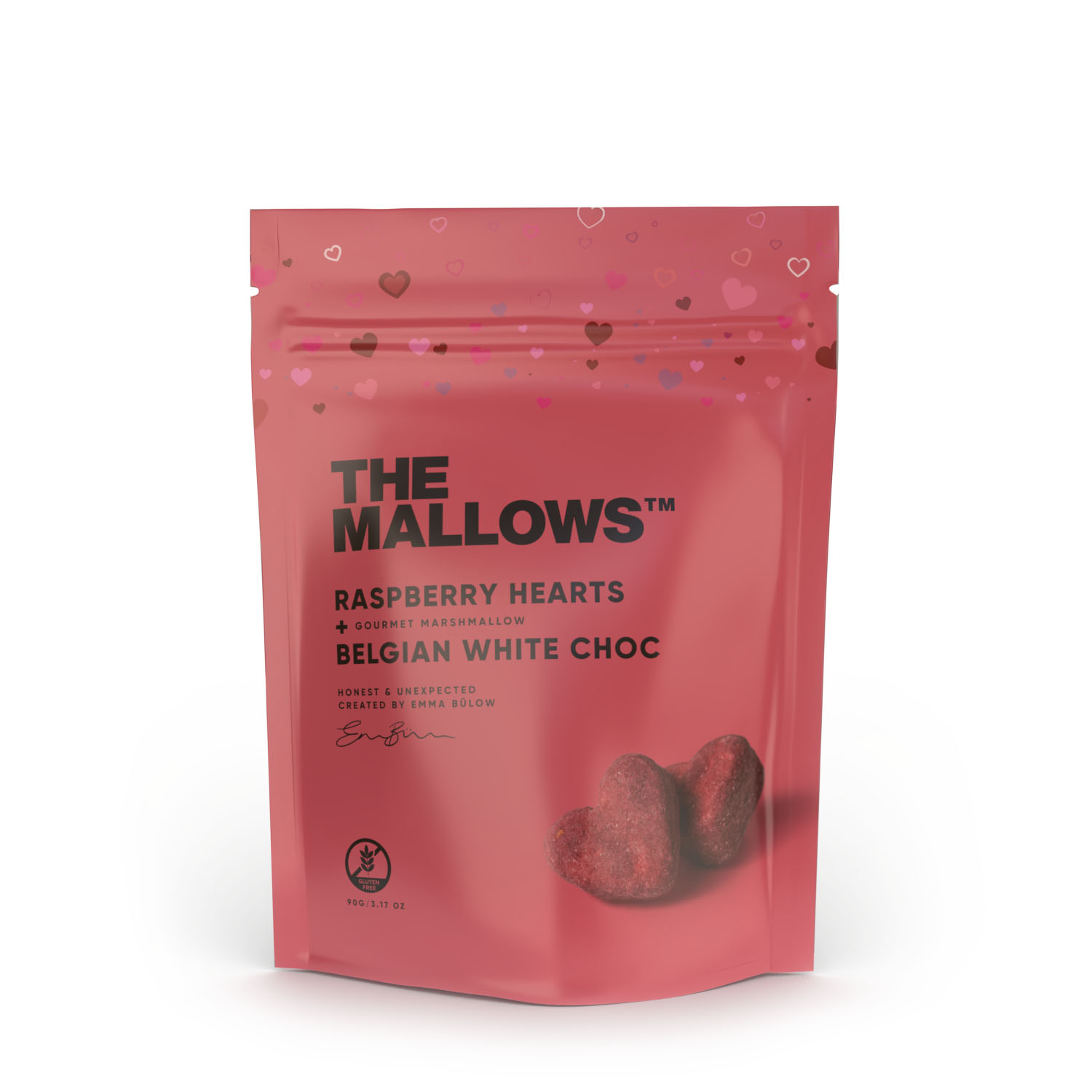 Mallow Hearts är en vaniljmarshmallow, dragerad i en krämig vit choklad från Belgien. I den vita chokladen finns smaken av hallon. Den vackra färgen kommer från ett tunt lager av hallon. Smaken har ett syrligt drag av citron som skapar en frisk och festlig upplevelse på tungan.