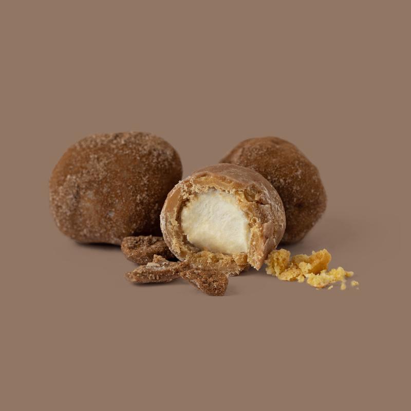 Små, söta marshmallows dragerade i noggrant utvald belgisk mjölkchoklad med små kaksmulor. Krispiga på utsidan och mjuka inuti.