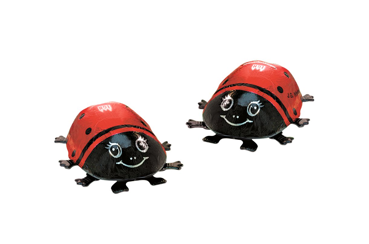 Nyckelpiga av fin marsipanfyllning omsluten av mörk choklad