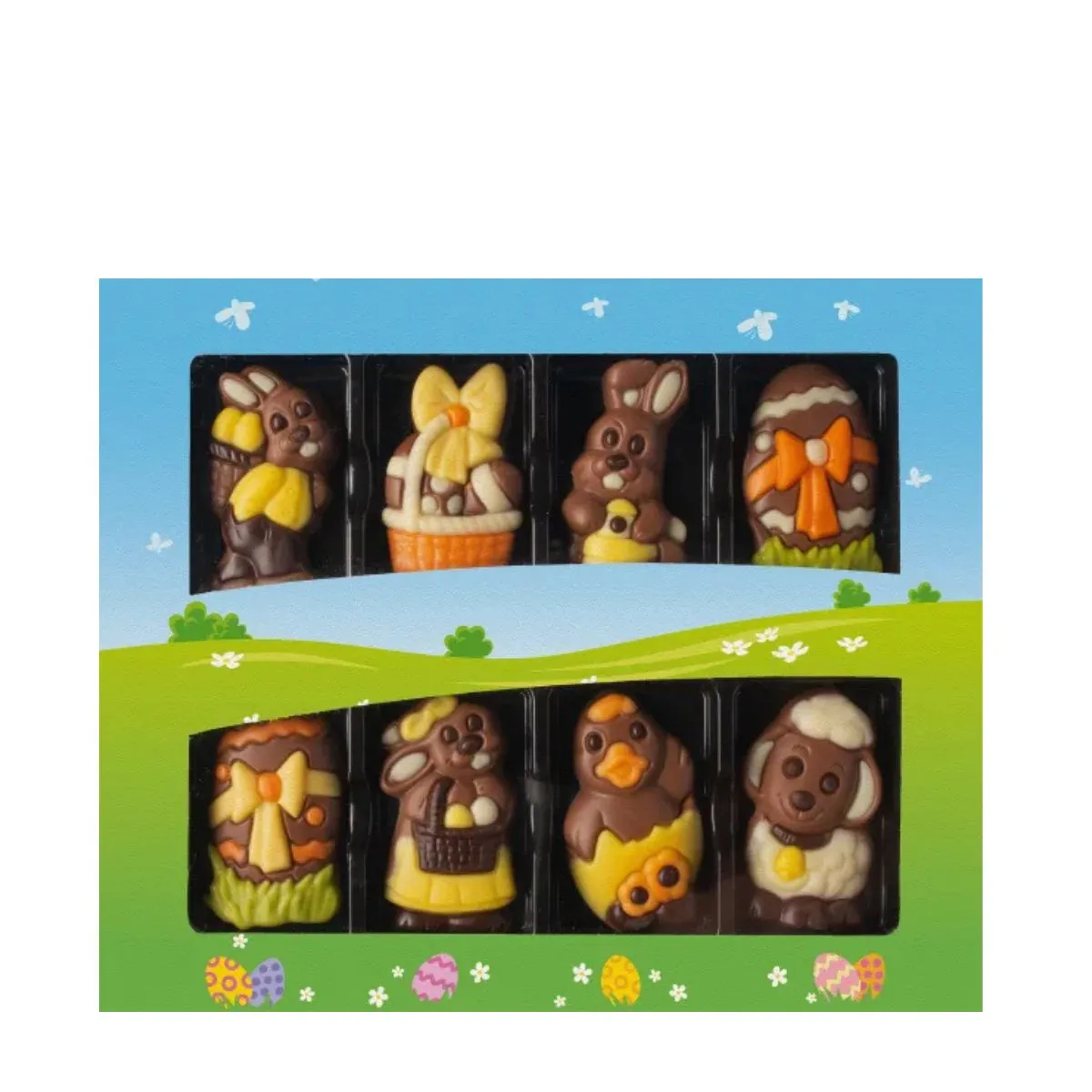 En festlig presentask fylld med 8 vackert dekorerade chokladfigurer i påskmotiv, gjorda av mjölk-, mörk- och vit choklad.