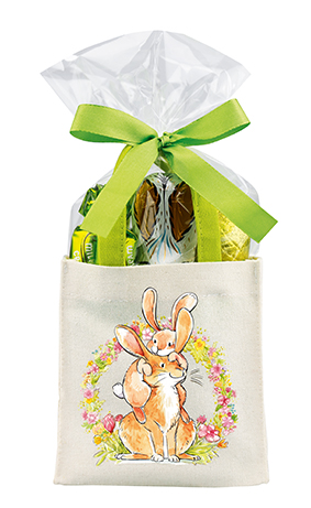 Presentpåse med påskmotiv, fylld med olika varianter av choklad