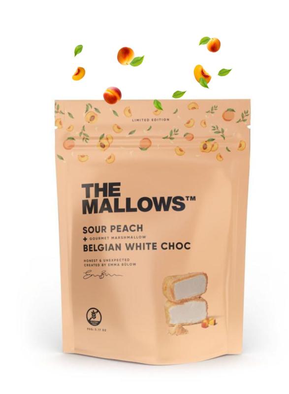 Gourmetvaniljmarshmallows täckta med len vit choklad och en fruktig touch av syrlig persika.