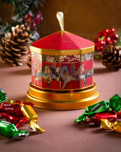 En magisk julgåva som både låter och smakar gott! Denna vackert dekorerade karusell i metall snurrar och spelar melodin “We Wish You a Merry Christmas”.